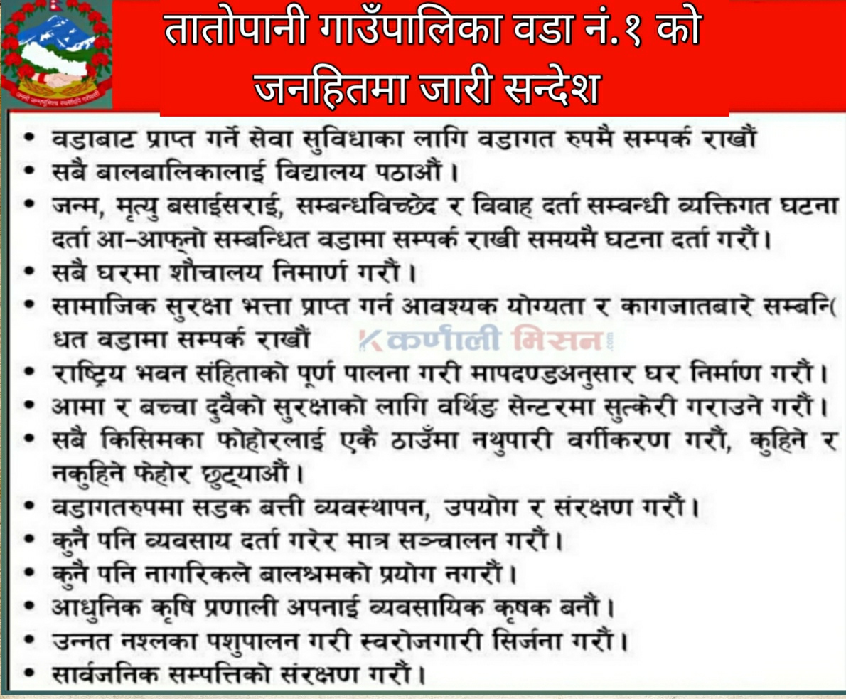 ताताेपानी गाउँपालिका वडा नं १ काे जनहितमा जारी सन्देश