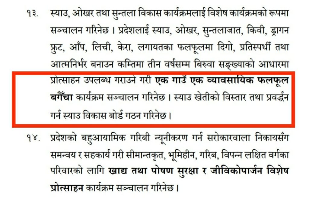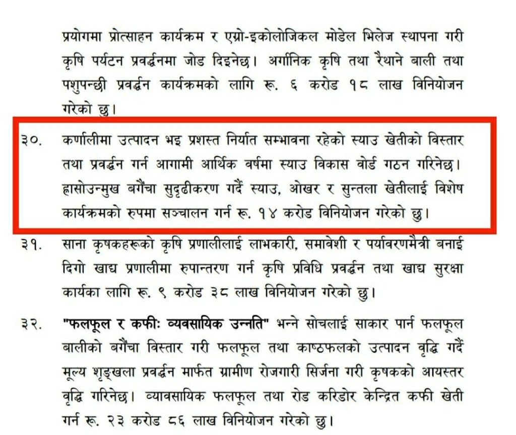 नीति तथा कार्यक्रमको बुँदा नम्बर १३ मा ‘स्याउ खेतीको विस्तार तथा प्रवद्र्धन गर्न स्याउ विकास बोर्ड गठन गरिने छ ।’ भन्ने उल्लेख छ । सरकारले प्रायः महोत्काँक्षी नीति ल्याउने तर बजेटमा प्रथामिकता नदिने प्रबृत्तीले नीतिमा आएपनि बजेटमा समेटिदैन् की भनेर जनता ढुक्क थिएनन् ।