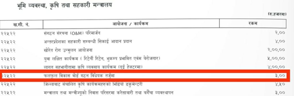भूमि व्यवस्था कृषि तथा सहकारी मन्त्रालयका प्रवक्ता बखत बहादुर खड्काले बजेट सिलिङ माग्दा खेरीनै पहिला फलफूल विकास बोर्ड भनेर पठाइएको बताए ।