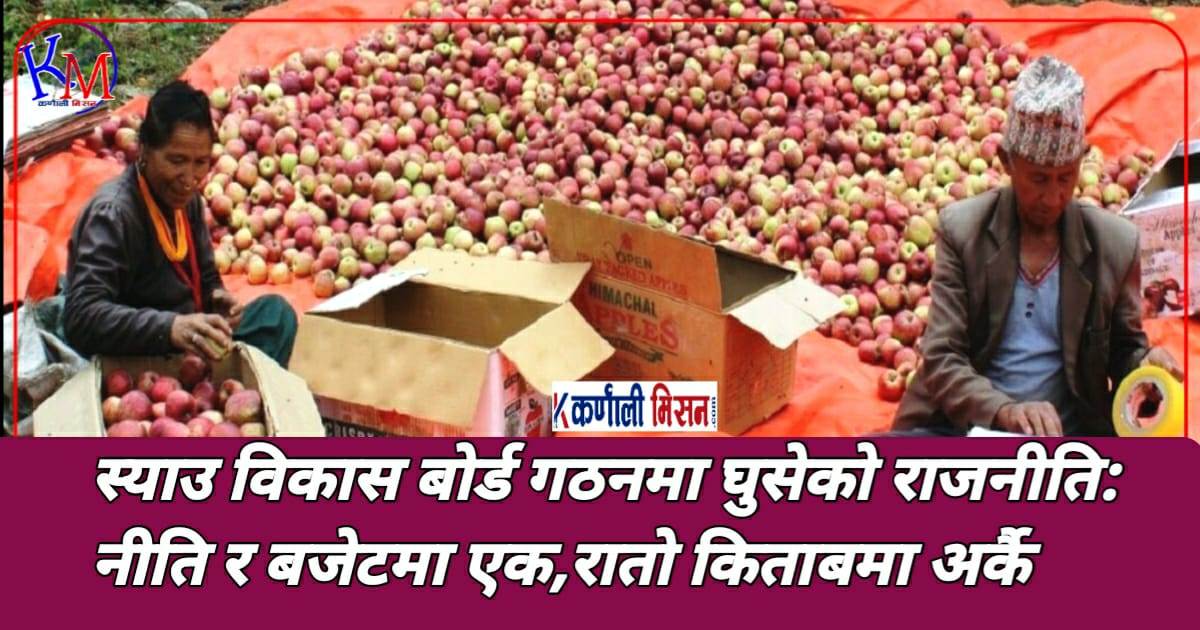 गत जेठ २१ गते कर्णाली प्रदेशका प्रदेश प्रमुख नजिर मियाँले आगामी आर्थिक वर्ष २०८२÷८३ को नीति तथा कार्यक्रम प्रस्तुत गर्दै स्याउ खेतीको विस्तार,उत्पादन बृद्धि र बजारीकरणलाई सहज बनाउन ‘स्याउ विकास’ बोर्ड गठन गर्ने बताए ।