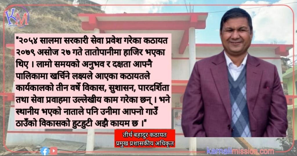 कर्णालीका ७९ पालिकामध्ये पहिलो पालिकाका रूपमा कार्य सम्पादन सम्झौता गरी जनमुखी, नतिजामुखी र लगानीनुसार उपलब्धि देखाउने गरी विनियोजित कार्यक्रम र योजनाको प्रभावकारी कार्यान्वयनमा जोड दिन भदौ महिनामै योजना सम्झौता सक्ने लक्ष्य लिइएको कठायतले जानकारी दिए ।