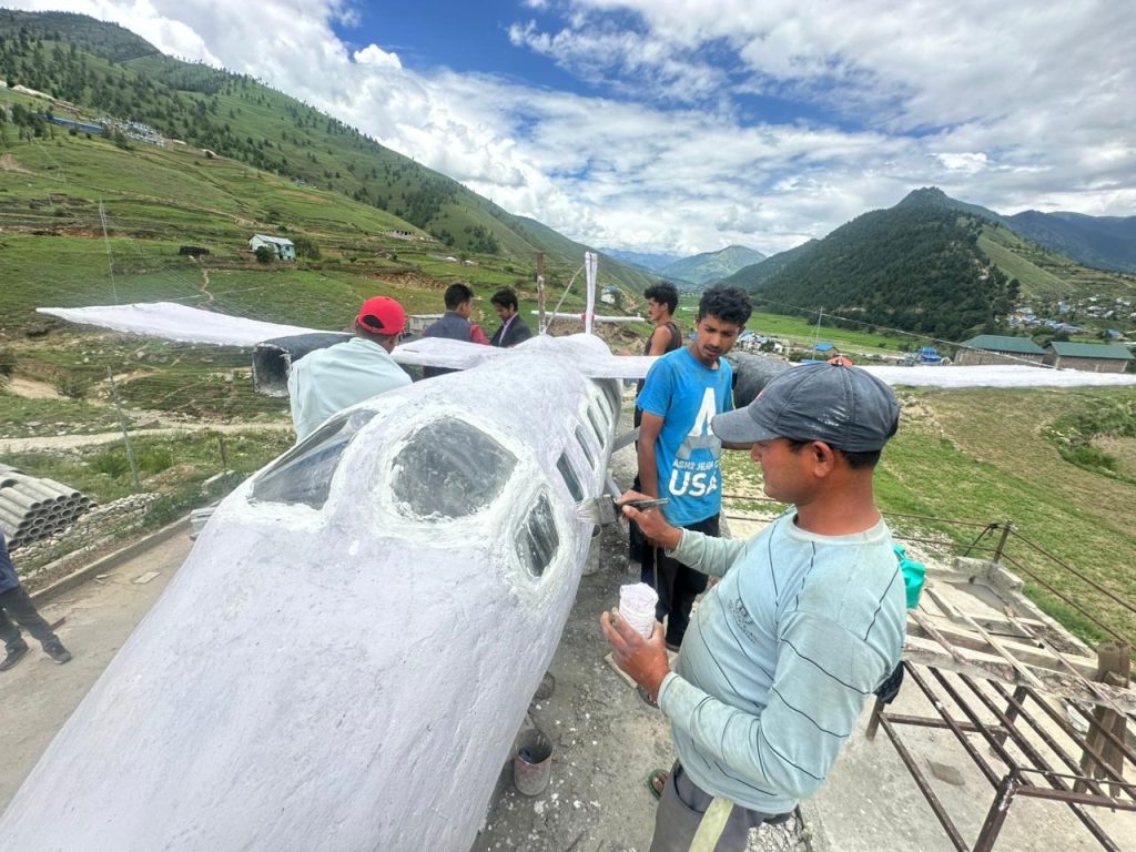 आफ्नै तीन तले  घरकाे छतमा बनाउदैँ गरेकाे जहाज अन्तिम चरणमा पुगेकाे छ । निर्माण नसकिदैँ जहाज संग फाेटाे खिच्ने र भिडियाे बनाउनेकाे घुईचाे छ ।