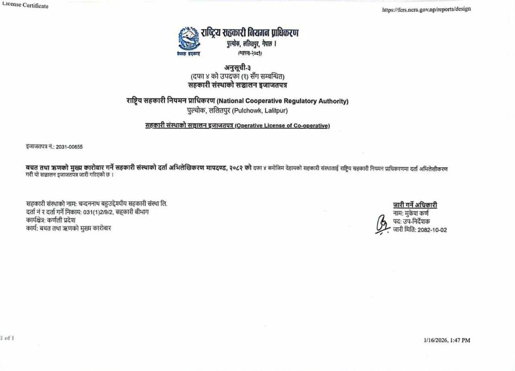 तर प्राधिकरण गठन भएयता कर्णालीका सयौ सहकारी मध्य वार्षिक साधारण गरेको, बाह्य लेखा परिक्षण गरेको, सुशासन कायम गरेको, बचत कर्ताको नियमित लाभांश बुझाएको आधारमा प्राधिकरणबाट ईजाजतपत्र पाउने चन्दननाथ कर्णालीकै पहिलो सहकारी बनेको छ ।