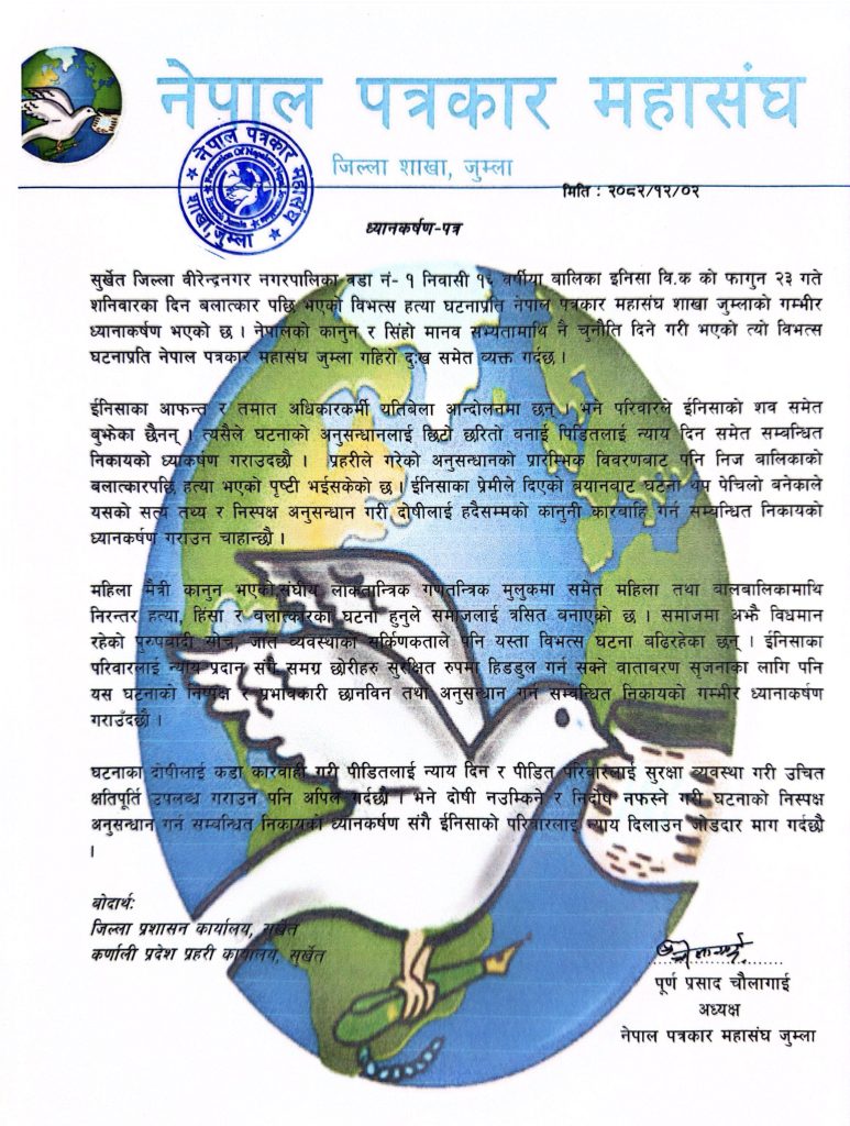 जुम्ला । सुर्खेतकी १६ वर्षिया बालिका इनिसा विकको बलात्कार पछि भएको हत्या घटनाको निस्पक्ष अनुसन्धान गर्न नेपाल पत्रकार महासंघ जुम्लाले ध्यानकर्षण बुझाएको छ ।