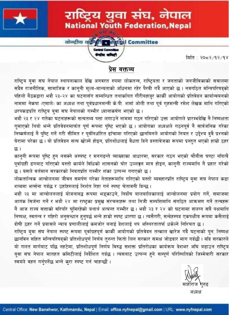 युवा सङ्घले भदौ २३ र २४ का घटनाहरूको छानबिन गर्न गठित गौरीबहादुर कार्की आयोगले सुरुदेखि नै निष्पक्षता गुमाएको आरोप लगाएको छ। वक्तव्यमा भनिएको छ, ‘यो प्रतिवेदन सत्य खोज्ने होइन, प्रतिशोधलाई वैधानिकता दिने दस्ताबेजका रूपमा प्रस्तुत भएको हाम्रो ठहर छ।’ कानुनी रूपमा पुष्टि हुन नसक्ने र मनगढन्ते व्याख्याका आधारमा सरकार गठन भएको २४ घण्टा नबित्दै गरिएको यो कार्य विधिको शासन र कानुनी राज्यमाथिको प्रहार भएको सङ्घको बुझाइ छ।