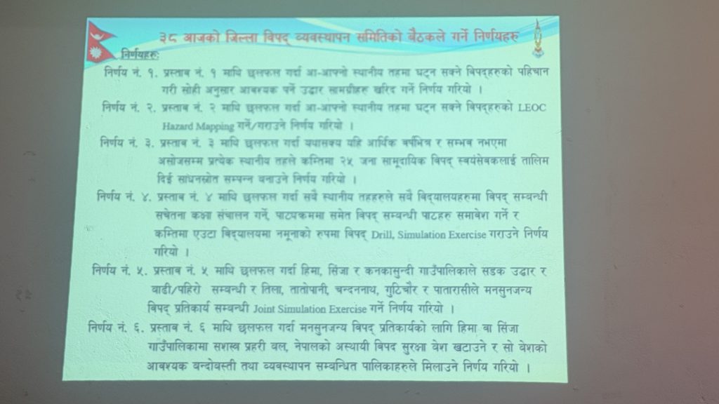 साथै सुरक्षाको निगरानीमा रहने गरी विपद गोदाम घर निर्माण गर्ने,प्रथामिक उपचारका लागि कर्णाली प्रतिष्ठानसंग समन्वय गर्ने, गैससका विपद उद्दारका कार्यक्रम एकद्धार प्रणालीबाट संचालन गर्ने,नदीजन्य वस्तुको अवैध उत्खनन् तत्काल रोक्ने र व्यवस्थित बनाउन पालिकाले नीति बनाउने लगायतका १३ वटा निर्णय भएको प्रजिअ पौडेलले जानकारी दिए ।