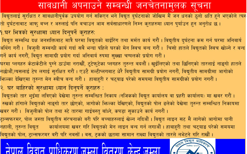 नेपाल विद्युत प्राधिकरण जुम्ला वितरण केन्द्रको जनहितमा जारी सन्देश